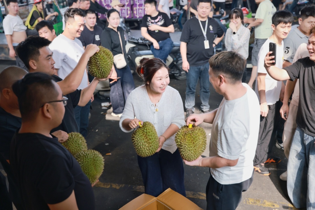 “欢迎大家来到广州江秾汇水果市场,我们这里的榴莲品种多、品质好、价格实惠,大家快来一起感受榴莲旺季的快乐!”赵智向全国采购商发出热情邀请。