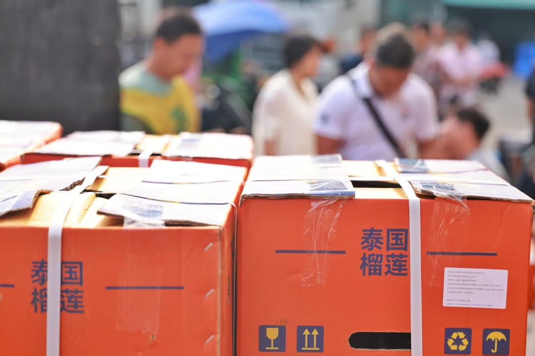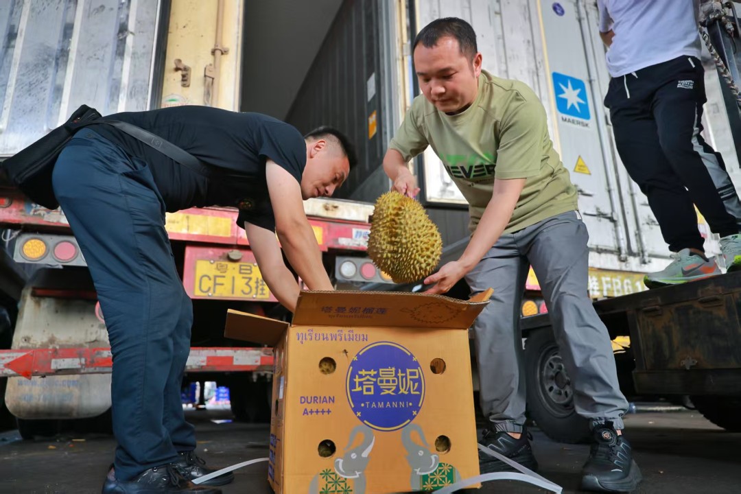 “塔曼妮这个品牌我拿了很多次,品质一直很稳定。每天只要一到货,我就要提前预订。今天装了200件,销往海南和长沙。”采购商谢先生告诉记者,他最看重榴莲果肉品质,“肉够黄、干爽、口感好。现在消费者都要干包黄肉,拿好货必须提前预订。”