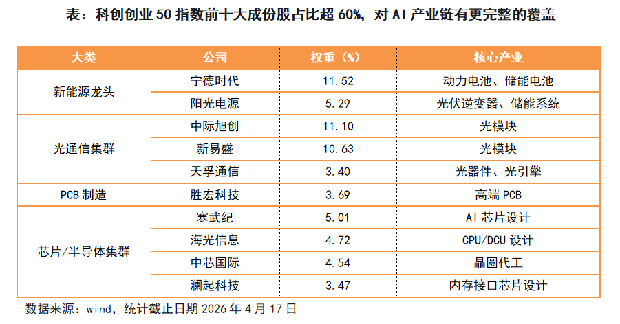 和聚焦创业板的创业板指数不同,科创创业50指数同时覆盖创业板中的高景气龙头,以及科创板中的硬科技核心资产。虽然它没有完全纳入“创业板七姐妹”,但在AI光模块、新能源、国产算力芯片、半导体制造等方向上的覆盖会更完整一些。