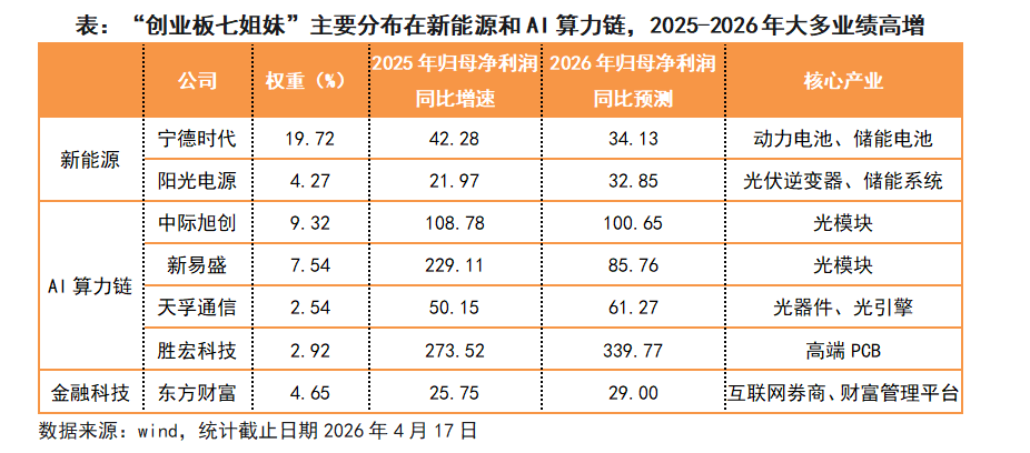 “创业板七姐妹”主要覆盖储能和光模块等方向中的龙头公司。从已披露的去年四季报和今年一季报来看,其中不少公司业绩增长较快。比如宁德时代和中际旭创的一季报数据都较受市场关注。这些权重股的业绩表现,为指数提供了基本面支撑。