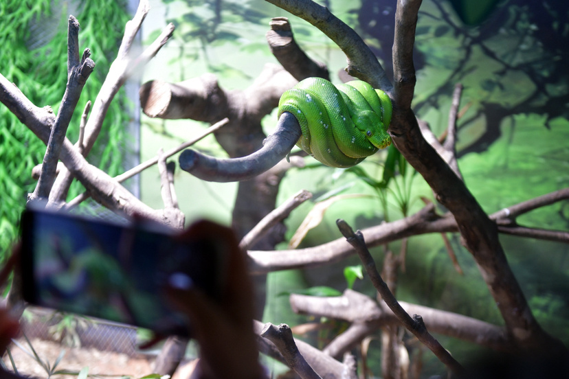 “巨龙苏醒”主题区内,各种夜行动物蓄势待发。黄金巨蟒、海岛竹叶青一改白天的隐蔽状态,摆出主动出击的狩猎姿态,凌厉且富力量感。地球上唯一有毒的灵长类动物——蜂猴也在此栖息,它们身形小巧迷你,长着圆溜溜的大眼睛,偏爱在晨昏时分活动觅食。