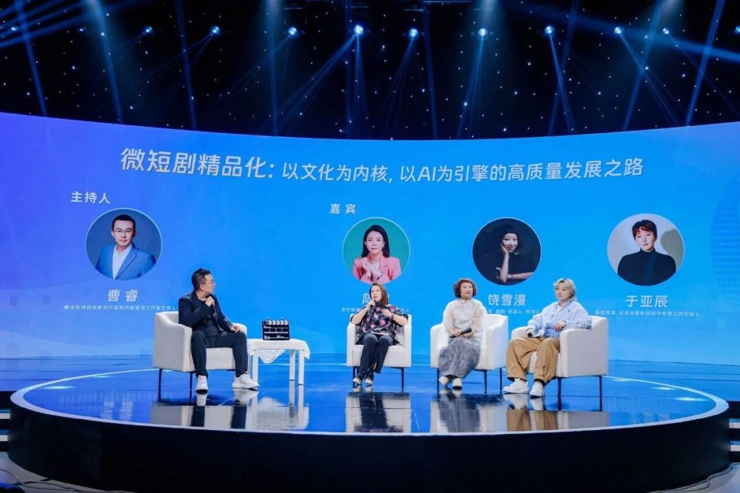 在行业对话环节,腾讯视频微短剧银河工作室负责人曹睿担任主持,与知名作家、编剧饶雪漫,东方微梦总经理、《搏忆》总制片人陈霁,新锐导演于亚辰,围绕“微短剧精品化:以文化为内核,以AI为引擎的高质量发展之路”展开深度探讨。