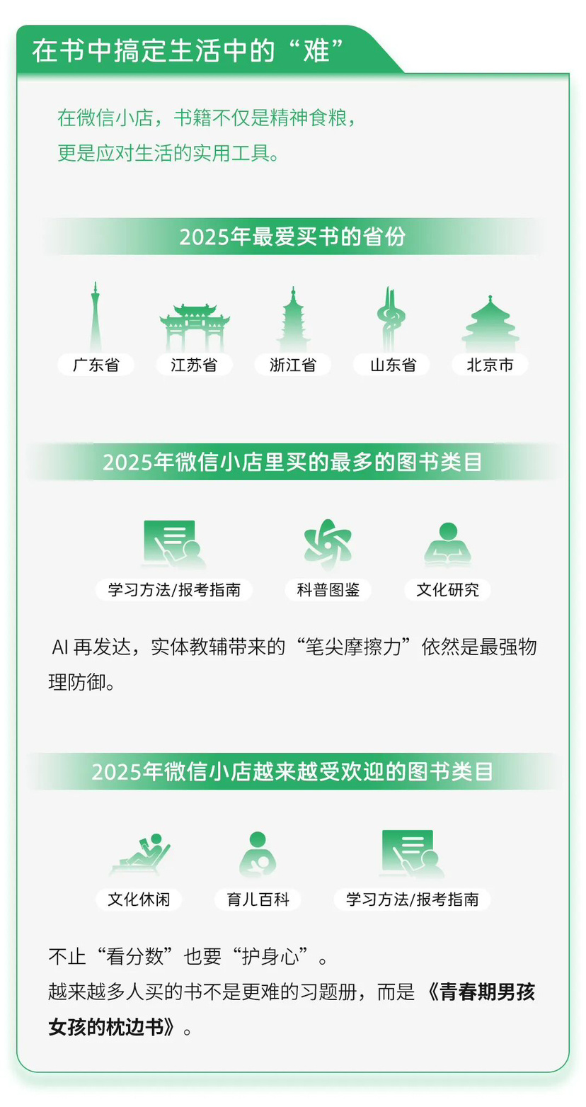 有人在线上读书,有人在线上买书。微信小店数据显示,2025年,最爱买书的地区分别是广东、江苏、浙江、山东和北京。微信小店里最畅销的图书类目分别是学习方法/报考指南、科普图鉴、文化研究;从销量增速上看,文化休闲、育儿百科、学习方法/报考指南位居前列,书籍不仅是精神食粮,更是应对生活的实用工具。