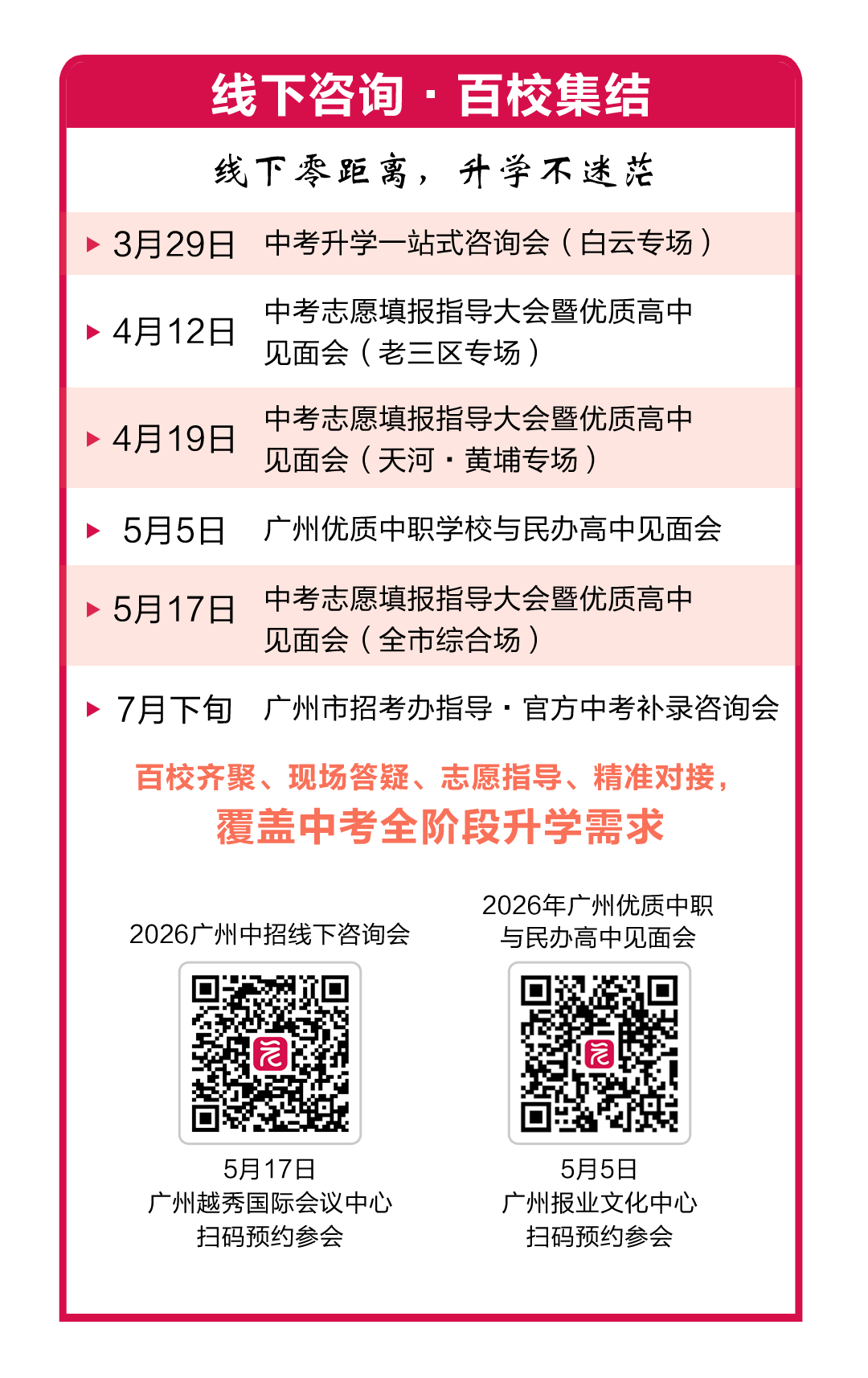 线下展会将邀请各普通高中、中职学校招生老师到场,与考生和家长面对面交流,解答办学特色、录取分数、志愿填报等热点问题。欢迎扫码预约,凭预约码入场。