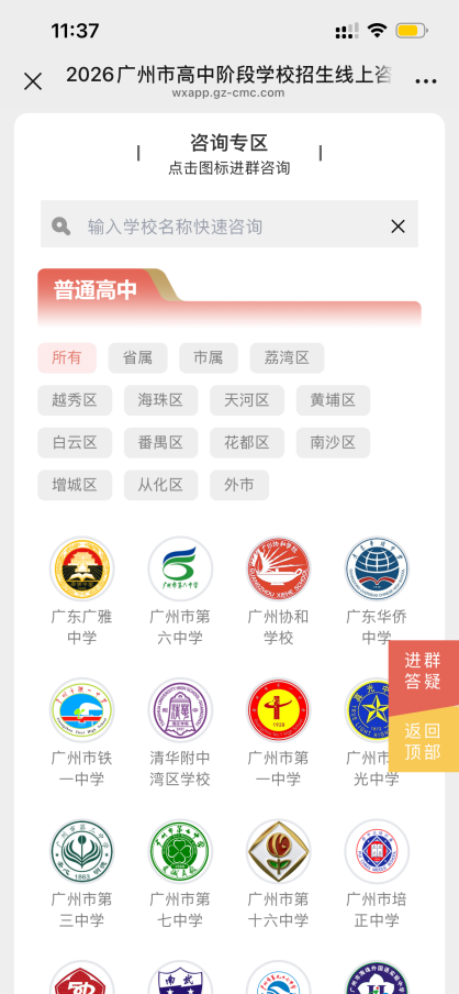 在往年成功举办的基础上,2026年广州中招线上咨询会重点解决了家长与学校之间的长效沟通渠道问题。最大的迭代亮点是:为每一所普通高中、中职学校单独建立咨询沟通群。