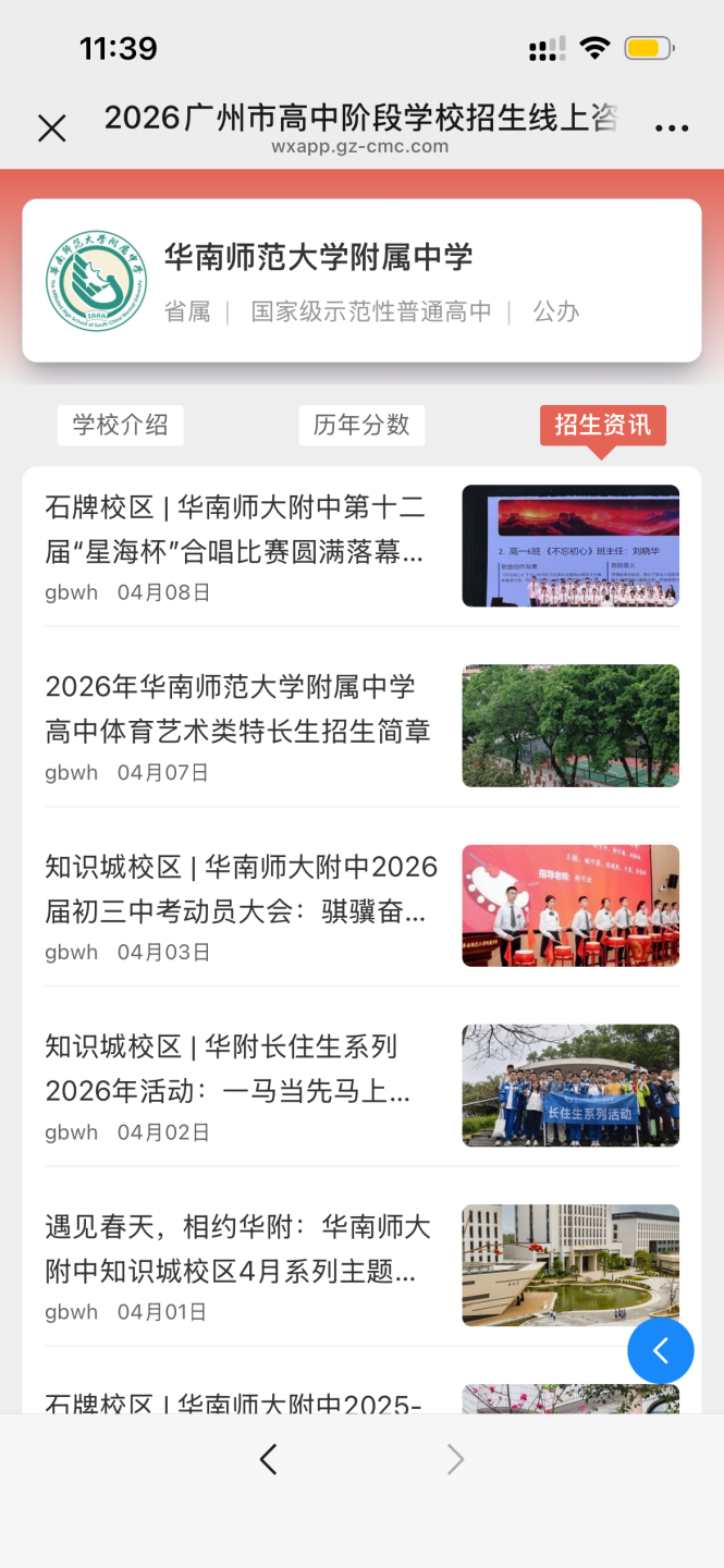 进入各学校专属页面后,可在该板块查看学校官方公众号的咨询列表,方便获取学校最新动态与联系方式。