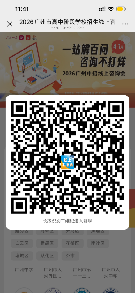 未能参加线下展会的家长,同样可以通过广州日报新花城App的“2026广州中招线上咨询会”专题页,浏览所有参展学校信息,并一键加入心仪学校的咨询群,享受与线下同等的直接沟通机会。