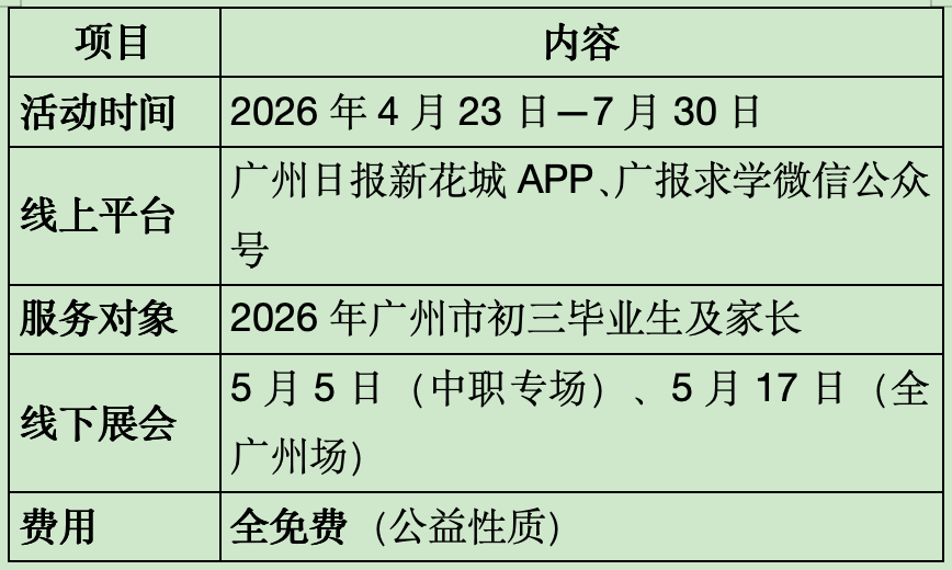 为深入落实教育部招生工作“阳光工程”,助力广大考生和家长科学填报志愿、合理规划升学路径,由广州日报报业集团(广州日报社)主办的“2026年广州市高中阶段学校招生线上咨询会”将于4月17日至7月30日举行。本次活动以广州日报新花城App为核心平台,为全市初三考生及家长提供全周期、公益性的招生信息服务。