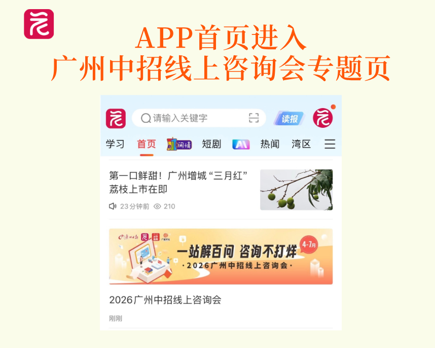 考生和家长即日起下载广州日报新花城App(←点击下载),在首页进入“2026广州中招线上咨询会”专题页面,即可: