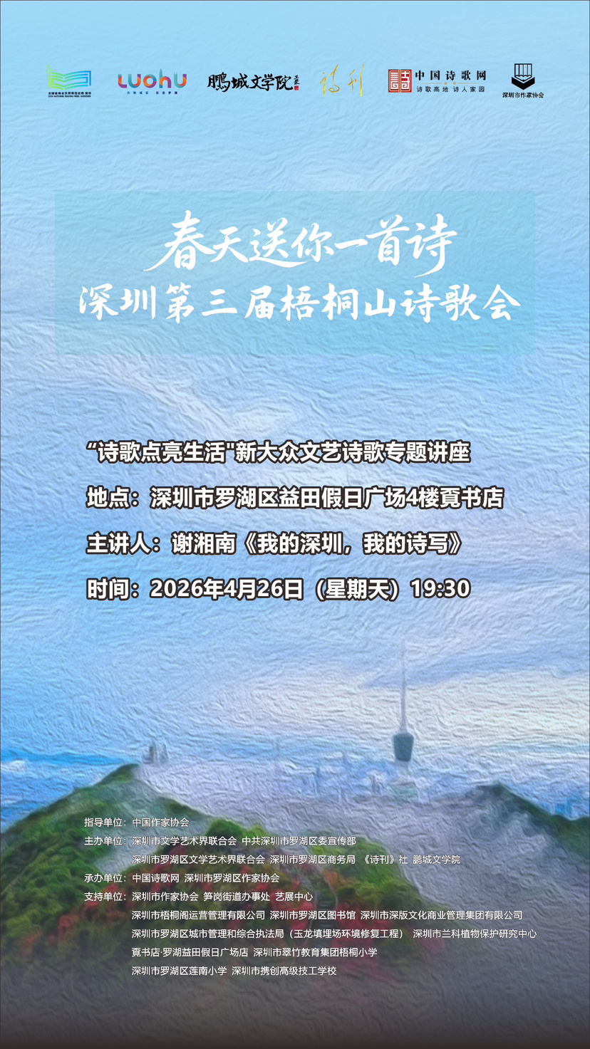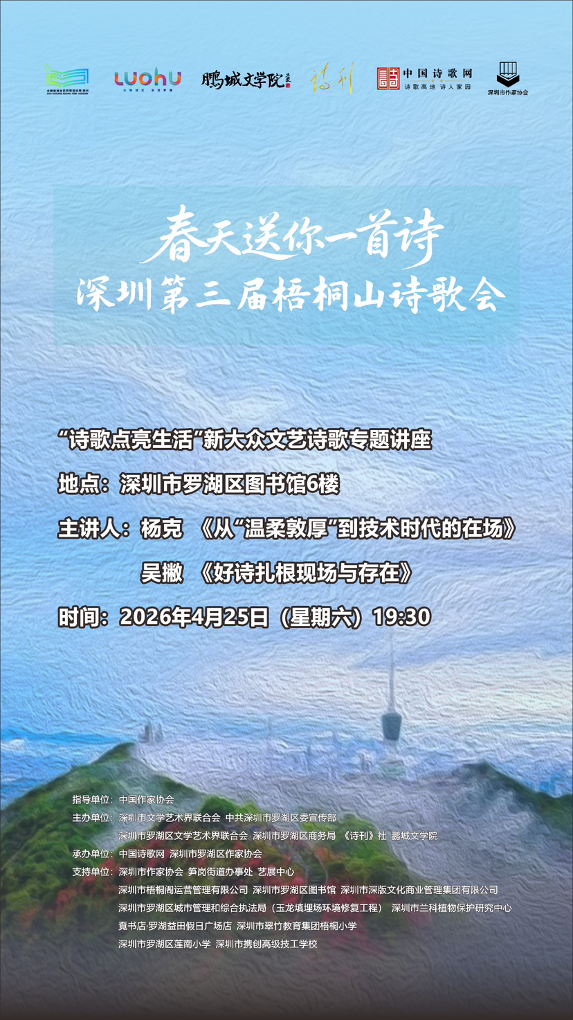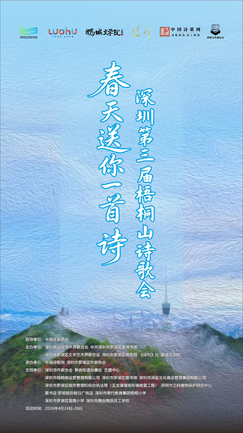 春风拂翠梧桐,诗意漫染罗湖。一场集结全国诗坛力量、彰显深圳人文风骨的文学盛事,正踏着芳菲春意,如约而至。4月24日至26日,“深圳第三届梧桐山诗歌会・春天送你一首诗”将启幕。该活动也是深圳市2026“全民阅读活动周”的重磅活动。