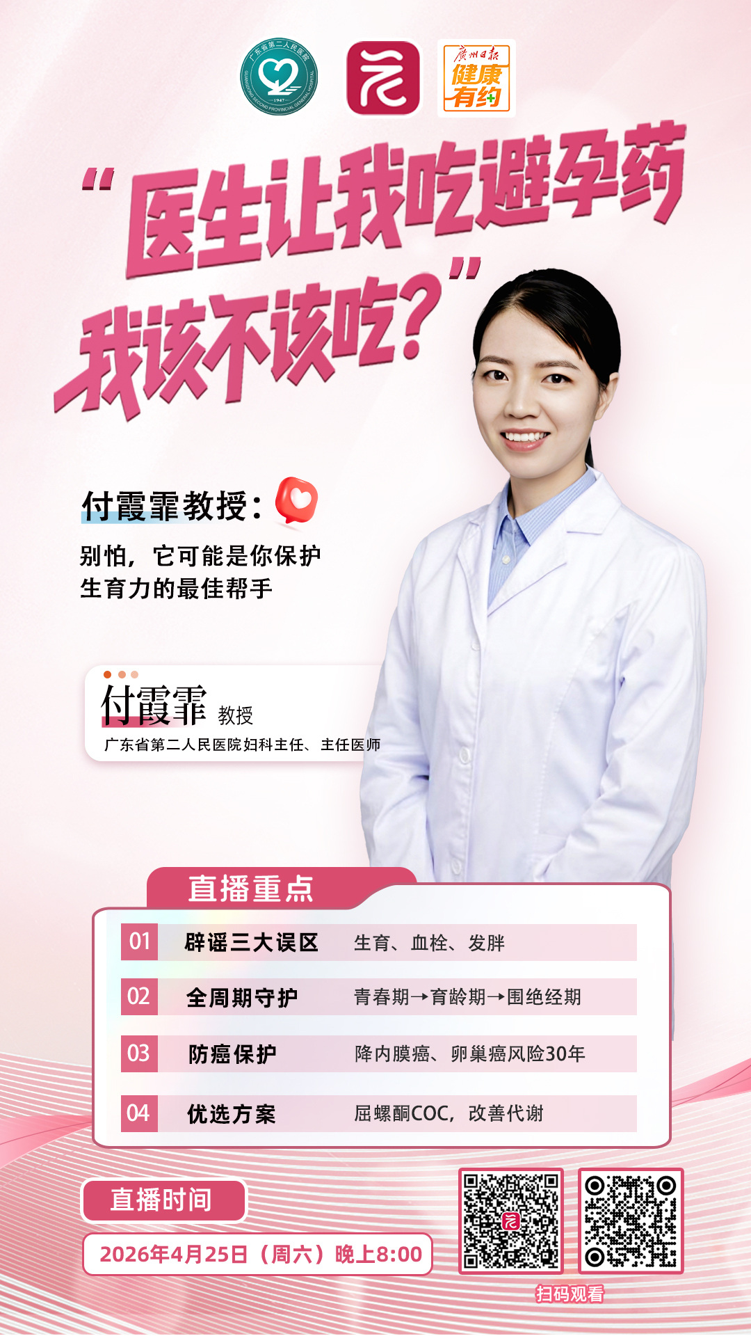 为了帮助大家正确认识复方口服避孕药的作用,4月25日(周六)晚上8时,广州日报健康有约特别推出《“医生让我吃避孕药,我该不该吃?”》的名医微课,届时,广东省第二人民医院妇科主任、主任医师付霞霏教授,将为大家深度解读新版COC共识的核心内容,帮助大家厘清认知误区,掌握科学用药方法,付教授还将在现场为大家答疑解惑,女性朋友们千万别错过!