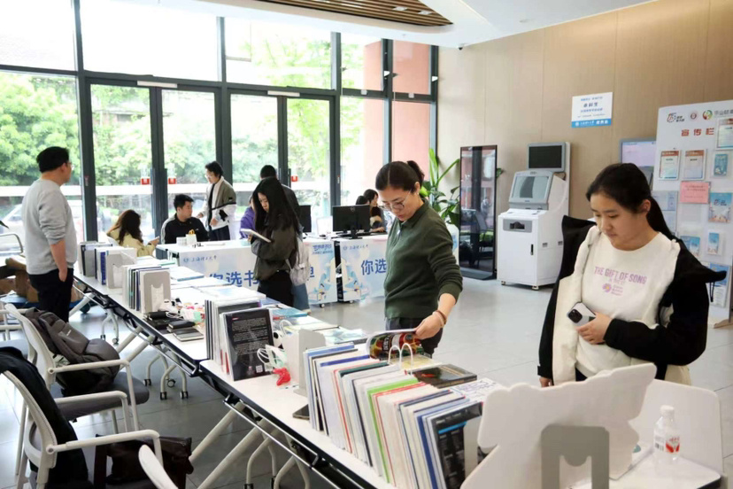 “你选书,我买单”图书区成为活动焦点,只见桌面上摆满了图书馆遴选的400余册新书,涵盖科技前沿、人工智能、文艺畅销等多元类别,打破传统借阅束缚,将阅读选择权真正交予学子:现场登记、即时采编,师生便能当场带走崭新书籍,在自主选择中开启专属阅读之旅。基础学部学生余晨坦言:“流程很快,新书让人格外珍视,这份期待,正是我们拥抱阅读、珍视知识的最好证明。”这份真切的感受,也让“阅读主理人”的内涵愈发鲜活。基础学部学生韩欣怡则被多样书籍吸引,她借阅了毛姆作品及AI与文化相关书籍,希望探究人工智能对文化产业的影响。“作为第一借阅人,新奇感十足,也更能激发阅读热情。”