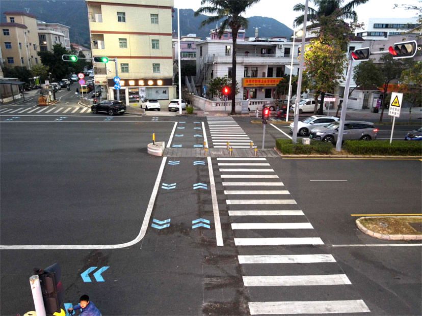 二是完善警示提示设施。在过街距离较长、电动自行车通行频繁的路口,增设“羽化标识”过街专用道,并拆除影响通行的分隔柱;同时,在路口处完善自行车等候区及通行区,引导骑行人有序过街;在人非隔离护栏端头等关键位置,设置带有反光标识的分隔柱与分道指示器,提升夜间及低照度条件下的警示效果。