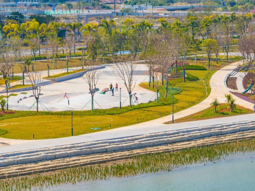 生态堤开阔的花舞广场让人眼前一亮,横沥岛尖“生态堤”的升级体验更为强烈。中交横沥总承包部负责人何锦明介绍:“灵山岛尖是南沙生态堤的1.0版本,开创了‘生态堤+公共空间’的先河;而横沥岛尖则是2.0升级版——植物种类从灵山岛尖的约180种提升至230余种,耐盐碱植物应用更广泛;同时,横沥岛尖强化了‘通风廊道’的预留和生物栖息地的精细化分区,实现了生态韧性、景观丰富度、市民舒适度的三重提升。”