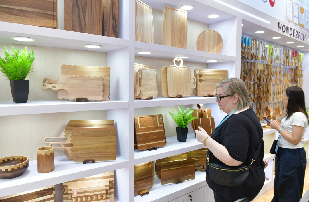 走进全新设立的竹木餐具专区,绿色成为最热关键词。龙竹科技集团股份有限公司展位前,一位中东客商正反复弯折手中的竹吸管,确认其韧性后,当场索要了样品册。“表面无涂层,却通过了德国和美国的高标准环保认证。”展位负责人一边演示一边介绍,“最大难点是竹子易脆易裂,要做得像彩带一样薄却不破损。竹子的生长周期只要3到5年,以竹代树、以竹代塑是近年来的新趋势,我们的产品越来越受欢迎。”