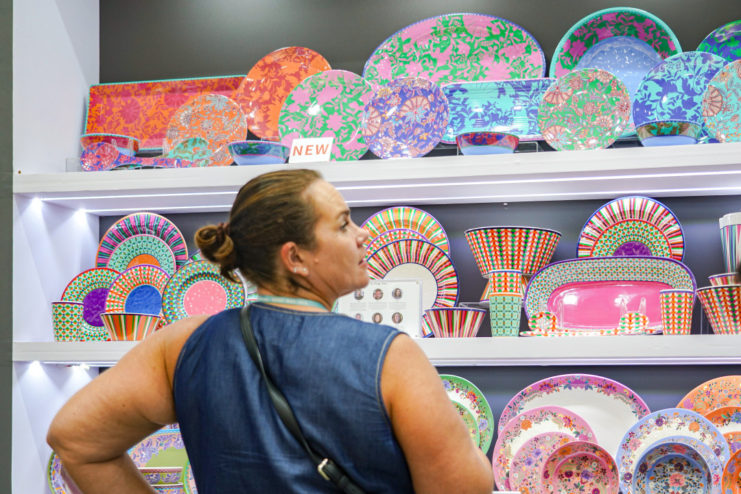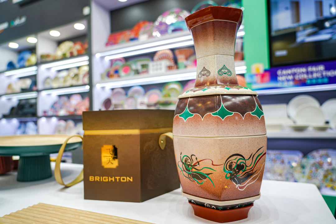 记者还留意到,福州悦腾家庭用品有限公司全球首创“R—Melamine密胺再生可持续技术”,不仅在福建设有总公司,更在广东设厂,源源不断的密胺餐具从生产车间出发,销往世界各地。展位上,一套“敦煌飞天餐具”吸引了不少客商——企业负责人演示时,将一个类似中式“梅瓶”的物件一一拆卸,变成了9个大大小小的盘碟,简单叠装后又变回六角花瓶模样。瓶身上的敦煌飞天纹样流光溢彩,这套将餐具与花瓶融合的创新设计,已荣获国家外观设计专利以及2025伦敦设计奖金奖等国际奖项。