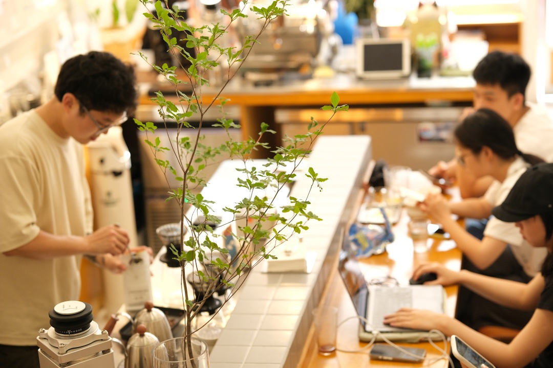 操作台旁,店主菲姐正专注地萃取咖啡,蒸汽轻涌,香气四溢。身旁客人轻声闲谈,语声温和,没有陌生的距离,只有如归家般的松弛与自在。