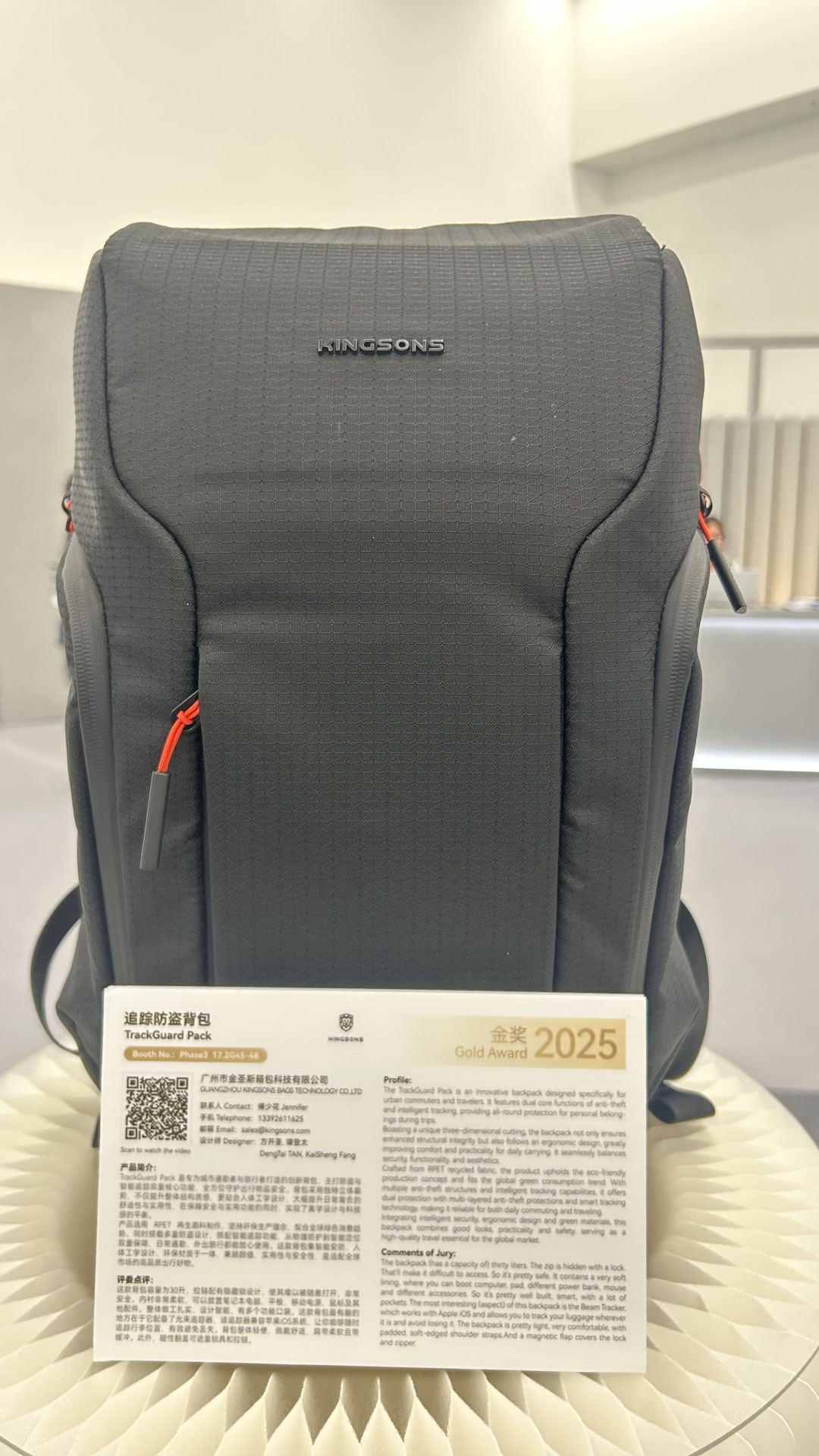 在金奖“天团”中,来自广州的企业表现亮眼。广州市金圣斯箱包科技有限公司研发的“追踪防盗背包”(TrackGuard Pack)斩获时尚类金奖,成为广东设计创新力量的代表。