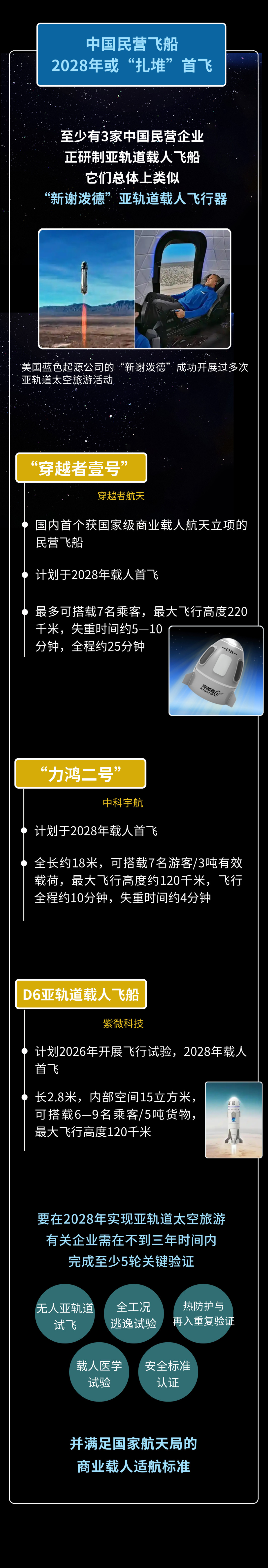 据人民日报报道,今年年初,中国一家商业航天公司展示了太空旅游计划,称包括演员黄景瑜在内的20余位太空游客和1名机器人已经预订,并计划在2028年实现载人首飞。
