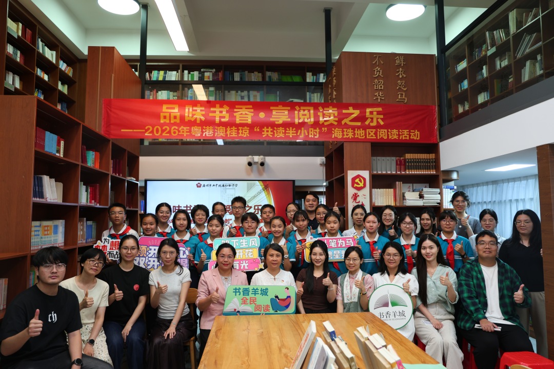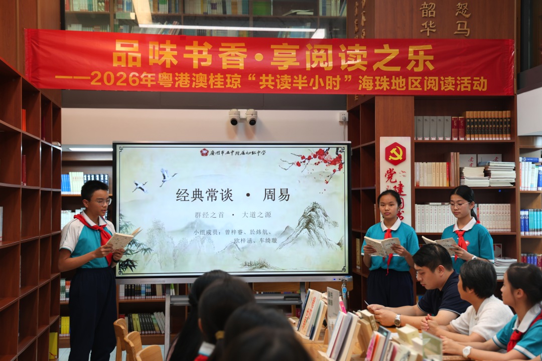 4月23日世界读书日,广州市第五中学附属初级中学图书馆内,一群平均年龄13岁的“少年主讲人”,分享阅读感悟,传递经典力量,这是学校参与2026年粤港澳桂琼“共读半小时”活动的现场。