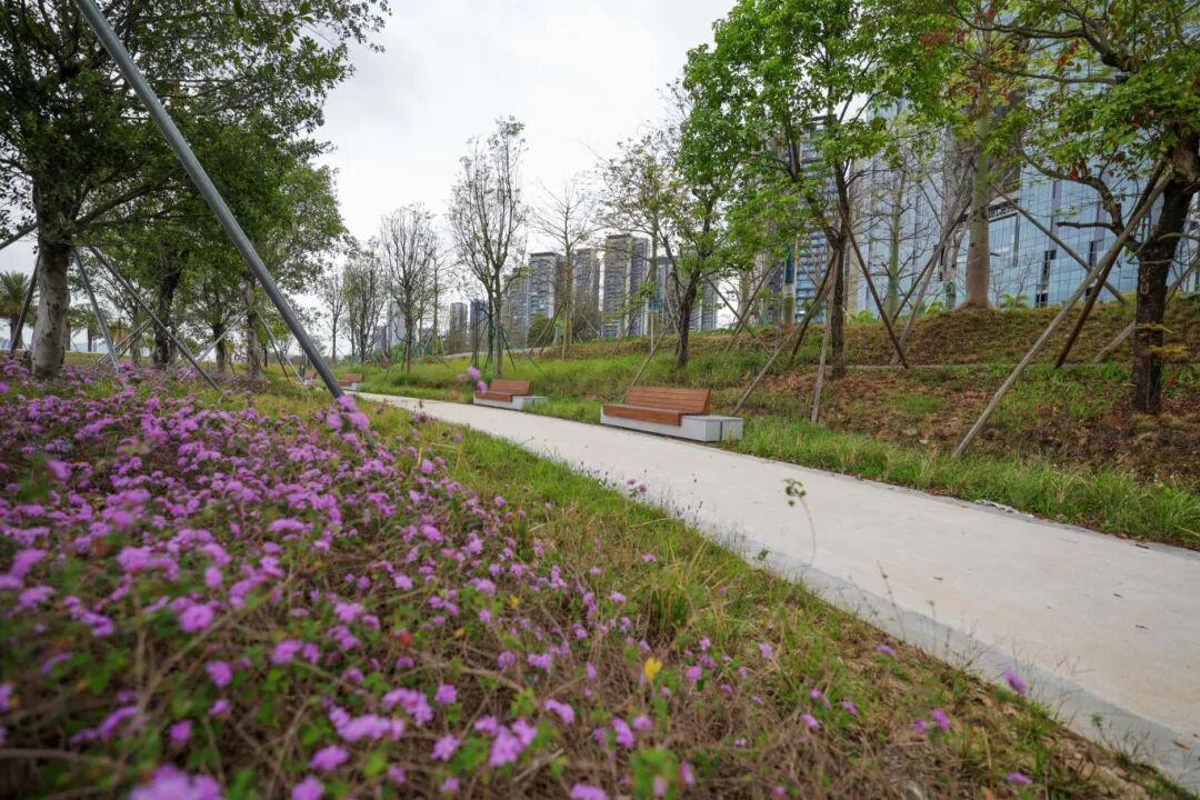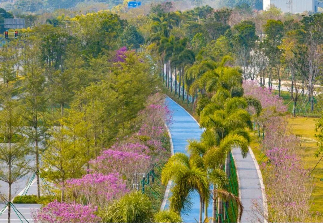 中交二航局横沥项目负责人介绍,“三季有花,四时皆景”的背后是上中下三维搭配:常绿乔木做上木骨架,灌木丰富中木林下,地被修饰下木基脚。仅乔木就有65种、2974棵,紫花风铃木、凤凰木、黄槿轮番绽放,无论何时赴约都有花景相迎。