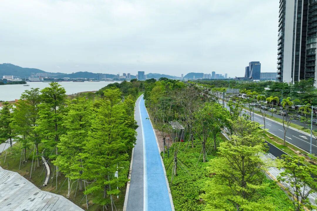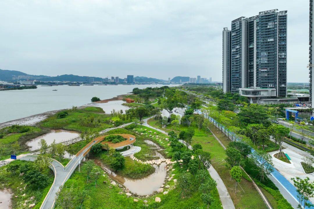 从空中俯瞰,堤顶路如丝带蜿蜒明珠湾畔,红树林、花境、草坪与远处天际线交织,绘出“推窗见绿、出门进园”的滨海画卷。它不仅是一座“绿色铠甲”,更是面向年轻人的滨水会客厅。