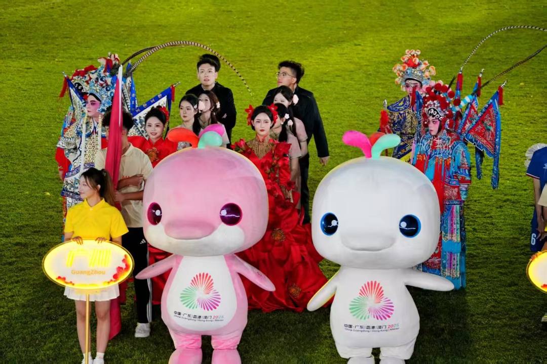 21城代表队入场仪式备受关注,由“喜洋洋”和“乐融融”引领,各队的执旗手、参赛运动员代表及各地市助威团排队进场。伴随着各队专属的说唱表演,体育场内,醒狮、粤剧、南拳、英歌舞、麒麟舞等非遗元素与现代舞台碰撞,骑楼、碉楼、风筝等元素伴随广府音乐,尽显21城文化交融。