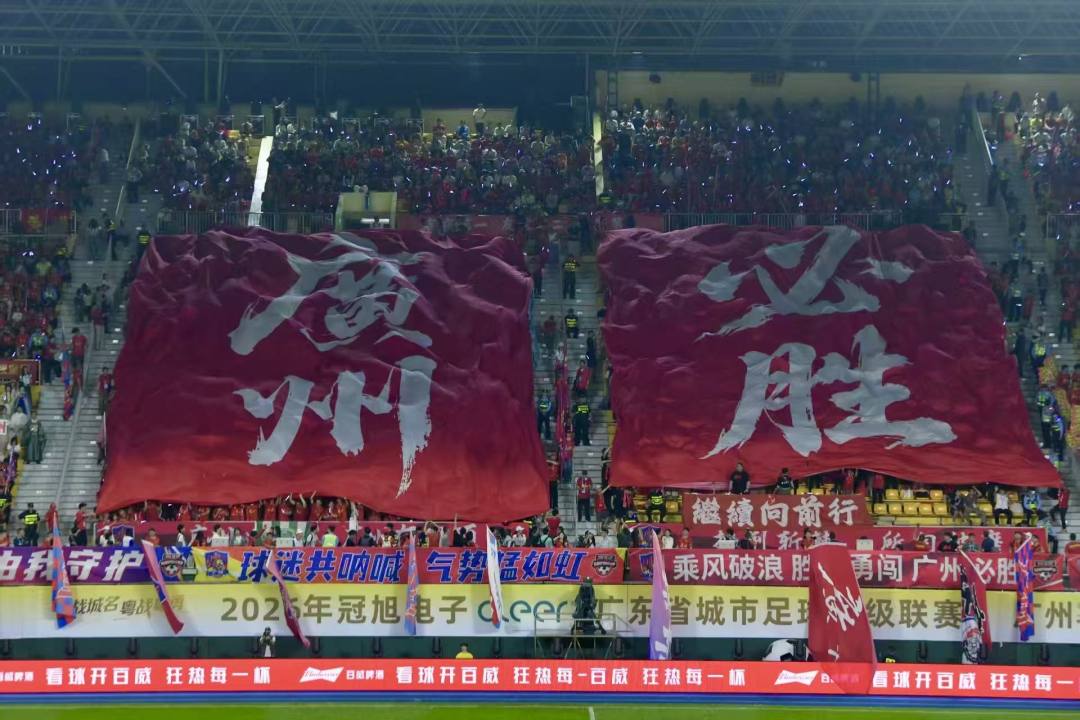 “广州必胜”“广州冇得顶”“威晒全场 冇得商量”“宵夜第一 友谊第二 比赛第三”……越秀山体育场化身“旗海”,30面主场队旗、10面助威横幅,搭配1500面球迷方阵旗海、5000面围巾墙,营造了浓厚主场氛围;在主席台对面还设置了主客场球衣巨幅TIFO展示。全场13000个数控灯助威棒,统一联动、同步闪烁,共同打造了气势恢宏、热烈震撼的赛事氛围。