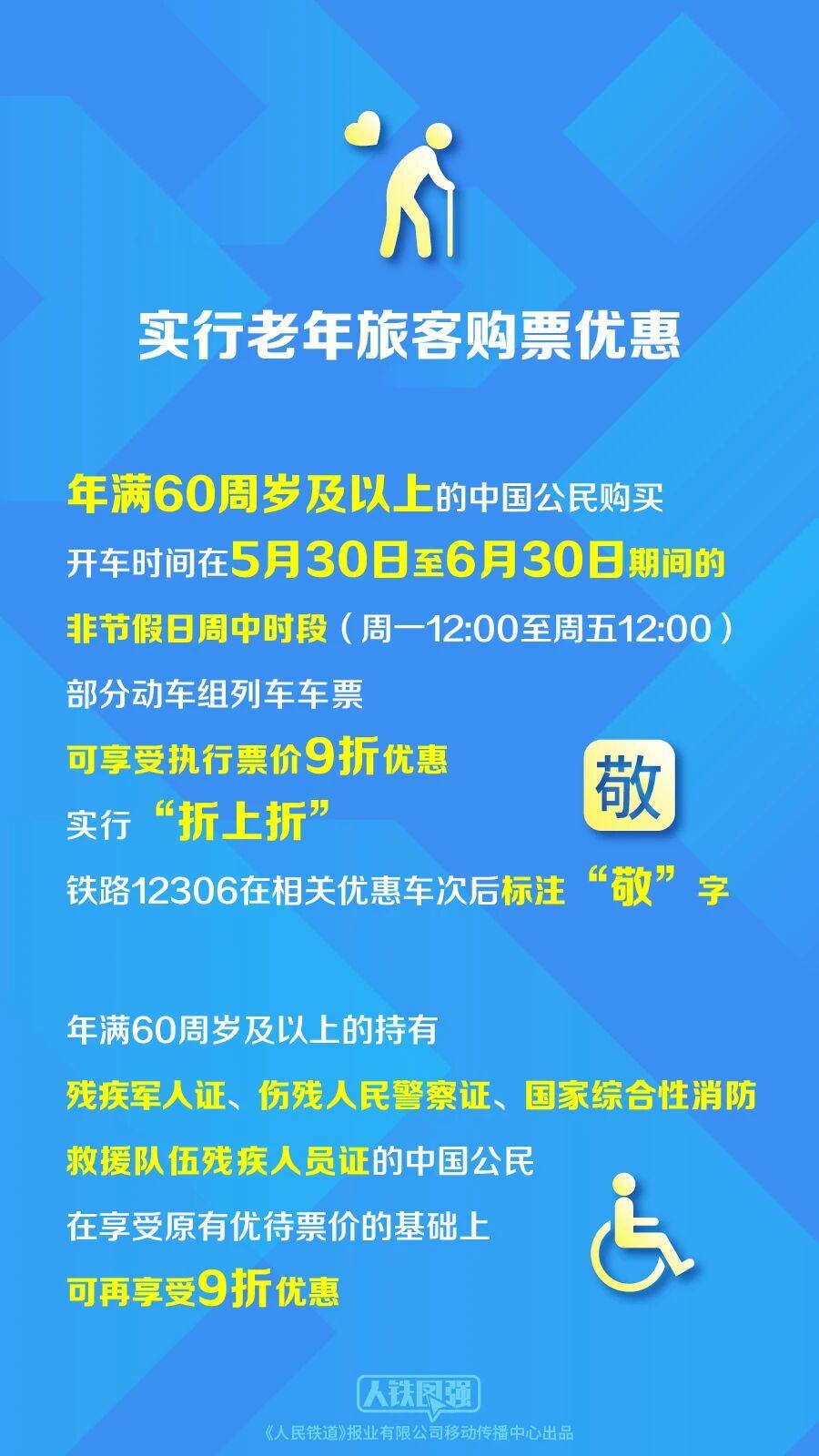 老年旅客购票优惠即将推出,年满60周岁及以上的中国公民购买开车时间在5月30日至6月30日期间的非节假日周中时段(周一12:00至周五12:00)部分动车组列车车票,可享受执行票价9折优惠,实行“折上折”,铁路12306在相关优惠车次后标注“敬”字。年满60周岁及以上的持有残疾军人证、伤残人民警察证、国家综合性消防救援队伍残疾人员证的中国公民,在享受原有优待票价的基础上,可再享受9折优惠。老年旅客可同时享受普通常旅客会员的三倍积分优惠,积分可用于兑换火车票或办理座位升席业务。