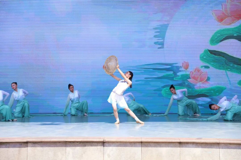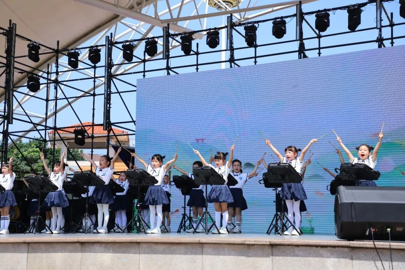 仪式后的文艺节目兼具烟火气与专业功底:幼儿园小朋友奏响小提琴曲《万水千山总是情》,琴声稚嫩却悦耳动人;榄核中学带来舞蹈《笠夏》,舞步轻盈清爽,尽展少年蓬勃朝气。