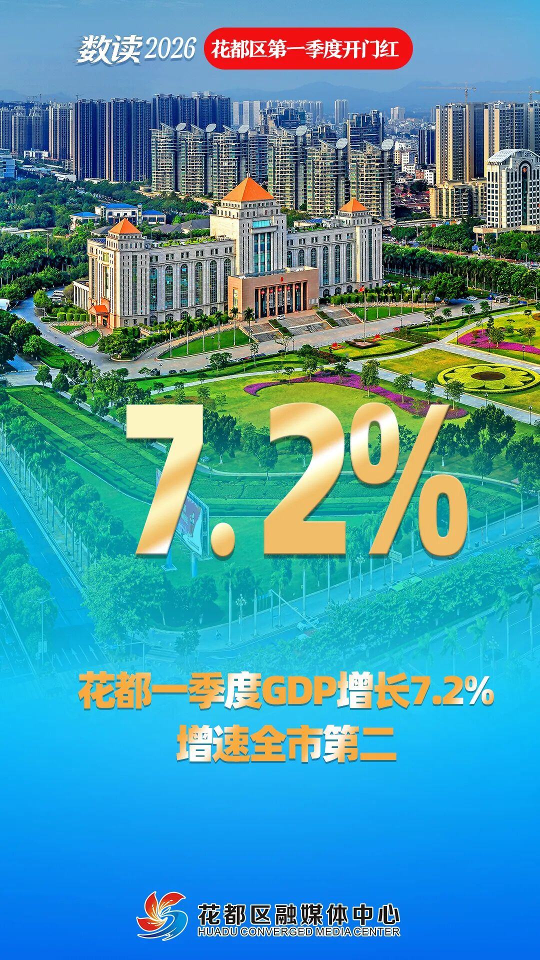 根据广州市地区生产总值统一核算结果,2026年一季度,花都区实现地区生产总值397.55亿元,同比增长7.2%,增速居全市第二。