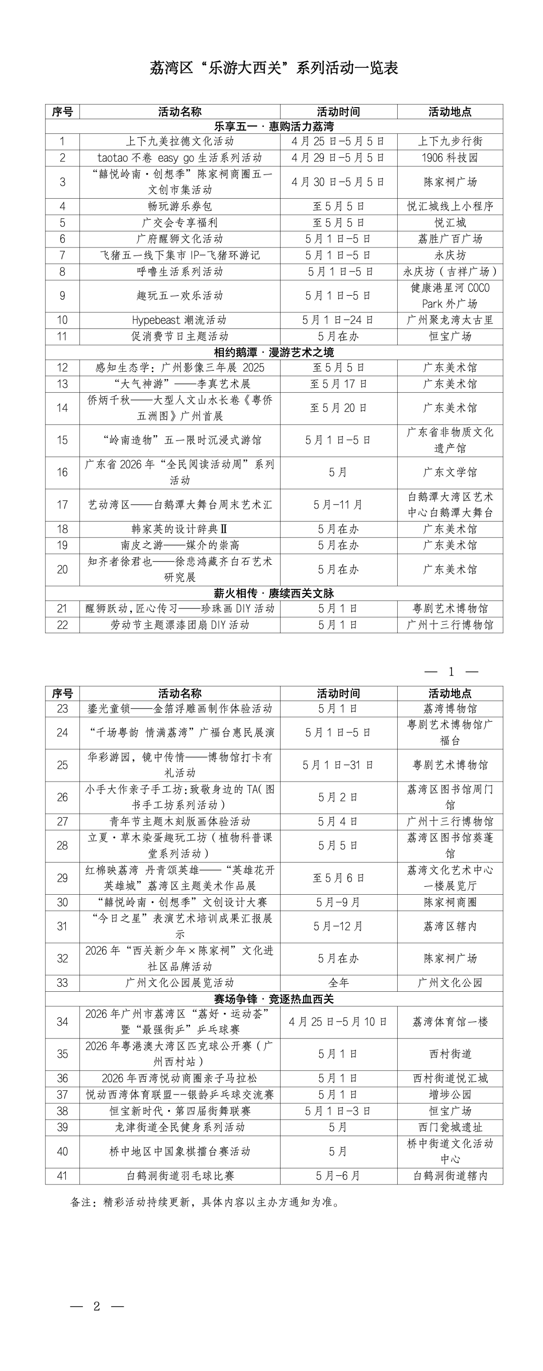 广州荔湾区“五一”假期以“乐游大西关”为主题举办系列活动,融合商圈消费、文化传承、旅游体验、体育赛事四大板块,精心准备了一场传统与新潮碰撞的文商旅体盛宴,诚邀市民游客共赴“五一”之约。