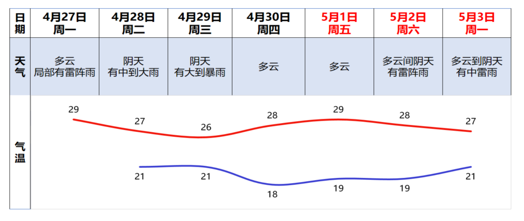 4月27日,市防汛防旱防风总指挥部办公室与市气象局、省水文局广州水文分局对我市的气象水文情况进行了会商。会商结论意见指出,预计,28日至29日,受高空槽和低涡切变影响,有8~10级雷雨大风、短时强降水等强对流天气,并有一次大到暴雨过程,最大小时雨强30~50毫米,过程累积雨量60毫米(局部70~80毫米),降水集中时段为28日傍晚到29日上午,重点关注从化、增城、黄埔;5月3日起,雷雨再趋频繁,间中雨势较大。市区天气具体预报如下:
