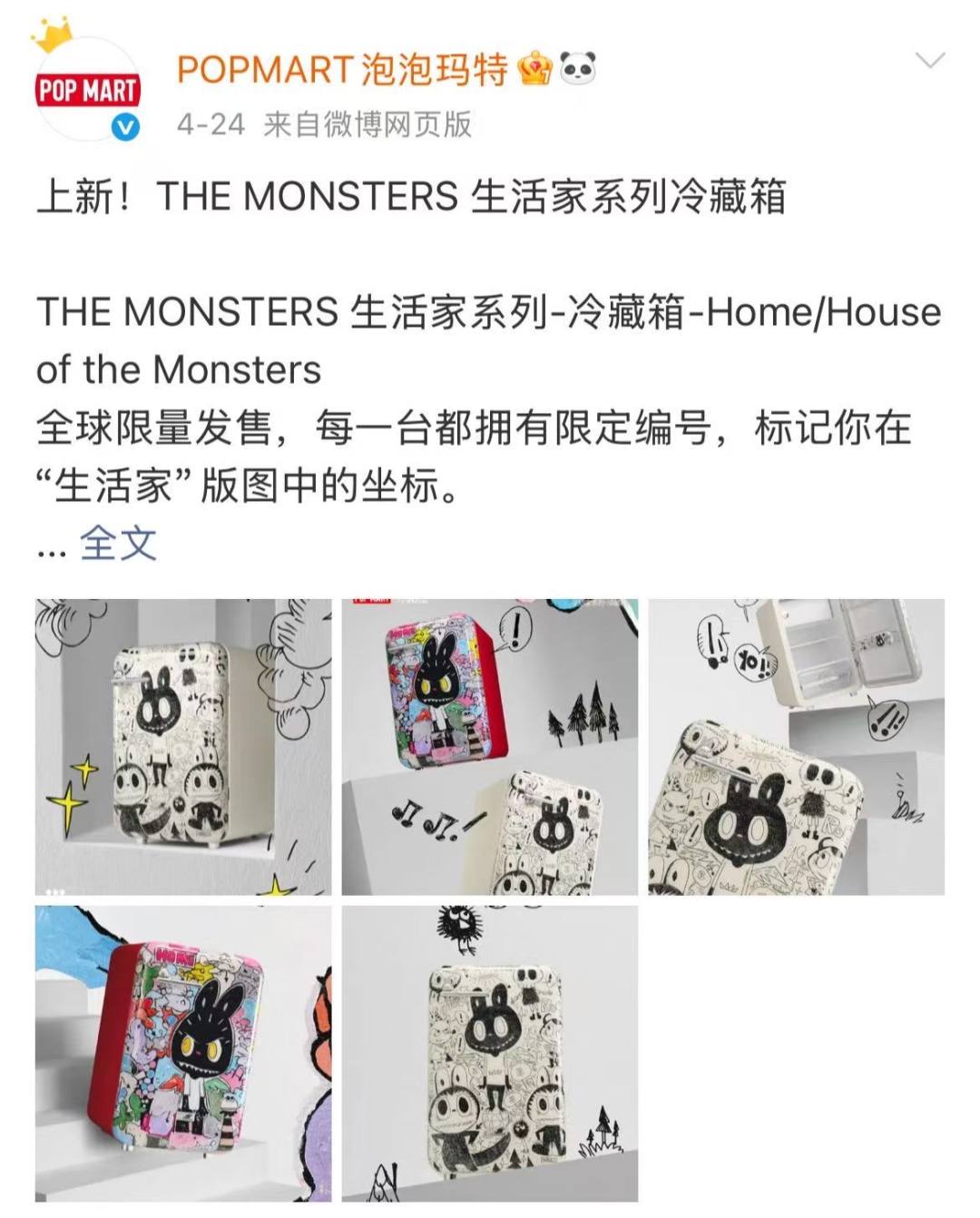 近日,泡泡玛特在社交平台正式发布其首款家电产品——“THE MONSTERS生活家系列冷藏箱”,两个系列各限量999台,售价5999元。因THE MONSTERS系列包含此前大热的IP LABUBU,这两款冰箱也被粉丝称为“LABUBU冰箱”,官方宣布将于4月30日22点正式发售。