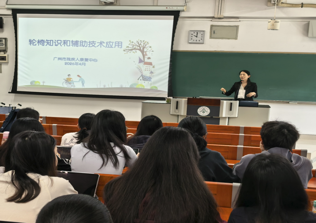 课堂上,陶健婷结合自身多年从事残疾人康复管理、辅具适配与康复服务的丰富案例,系统阐释了“平等、融合、共享”的助残服务理念。随后,辅助技术部敖永辉现场演示轮椅等辅助器具的正确使用方法,并组织学生分角色扮演肢障人士与服务人员,在模拟上下坡、转弯等真实场景中,逐步掌握轮椅辅助服务的专业技巧。