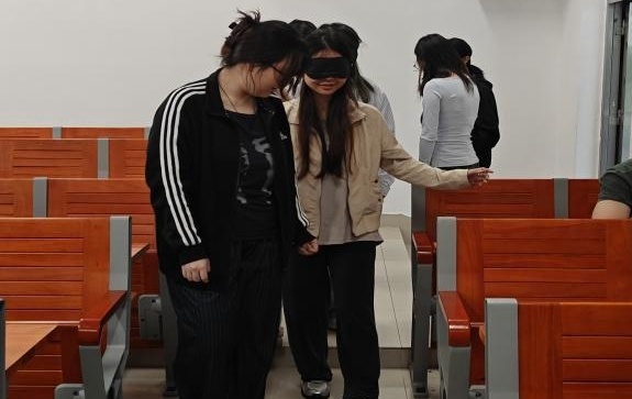 在角色扮演环节,同学们两两结对,一人戴上眼罩模拟视障者,一人担任导盲陪伴者,在教室中完成行走、避障、上下台阶等任务。现场还准备了盲文写字板、盲文纸笔等教具,同学们亲手尝试在盲文纸上刻写“中国”二字,近距离感知盲文的独特结构。不少学生感慨:“盲文的每一个点都要用力刻写,过程非常缓慢,而且还要遵循‘正摸反写’的规则倒过来刻写,真切体会到了视障人士读写的不易。”