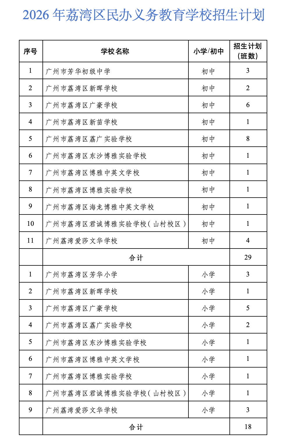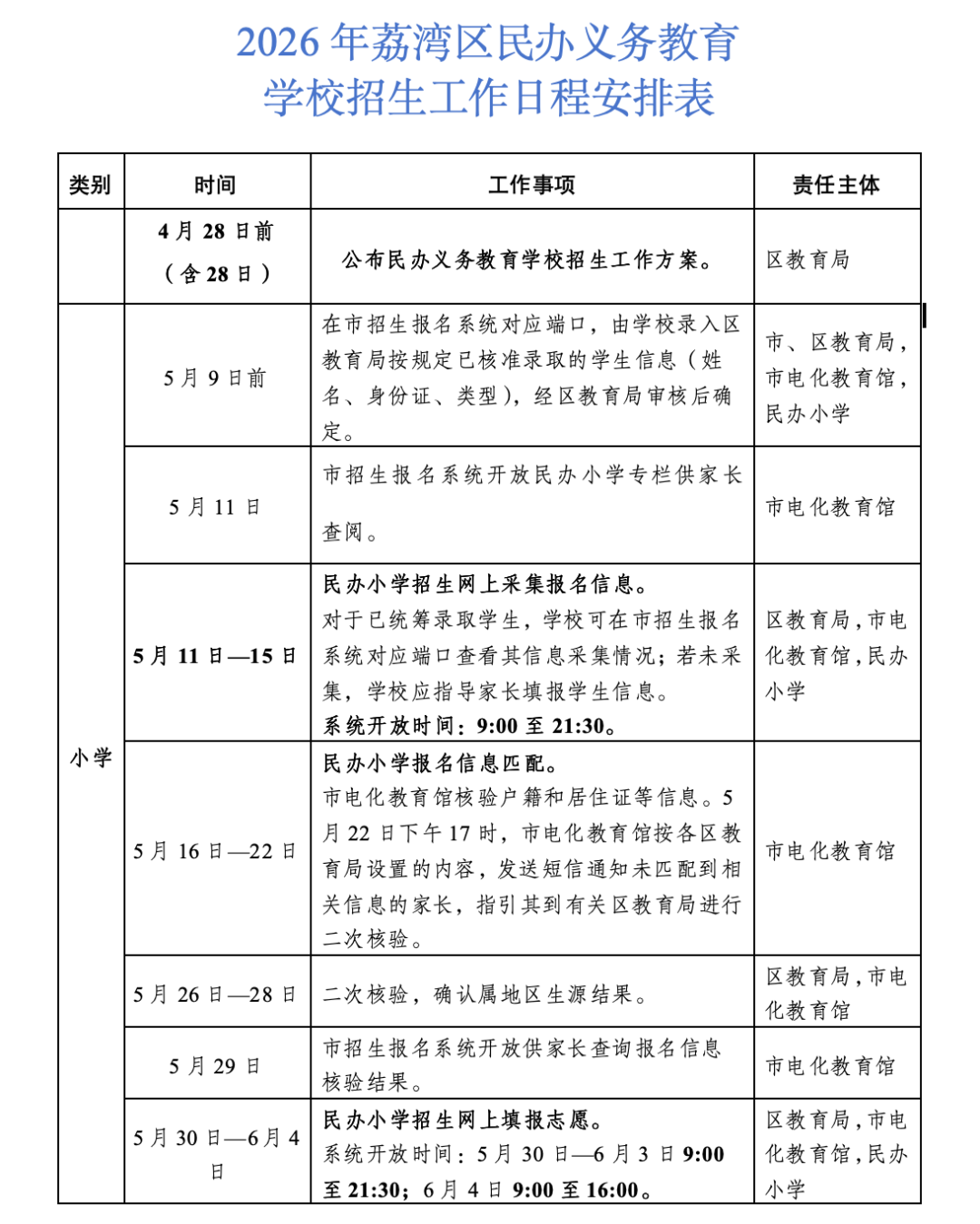 4月28日,广州荔湾区公布2026年民办义务教育学校招生工作方案。根据方案,所有民办学校都要严格执行免试入学规定,在核准的招生计划与招生范围内,按照区教育局统一安排进行招生。坚持小学一年级“零起点”教学;严禁学校以考试或变相考试形式进行招生。全面取消义务教育学校各类特长生招生。各学校要严格按照招生计划进行招生,按照招生工作日程安排表组织实施。新生入学后,学校按《广州市教育局关于印发义务教育学校起始年级均衡编班工作实施方案的通知》做好学生编班工作,并按省、市有关学籍管理规定向区教育局做好学籍申报、确认工作。学校要严格落实“一人一籍,人籍一致”的学籍管理要求,严禁“人籍分离”“双重学籍”等情况出现。