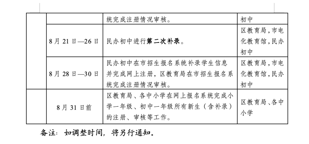 1.报名人数小于或等于招生计划数的民办学校,实行直接录取。民办学校在“广州市义务教育学校招生报名系统”向拟录取的新生发出预录取通知,适龄儿童少年的父母或其他法定监护人收到预录取通知后完成网上确认程序,民办学校直接确认录取名单。