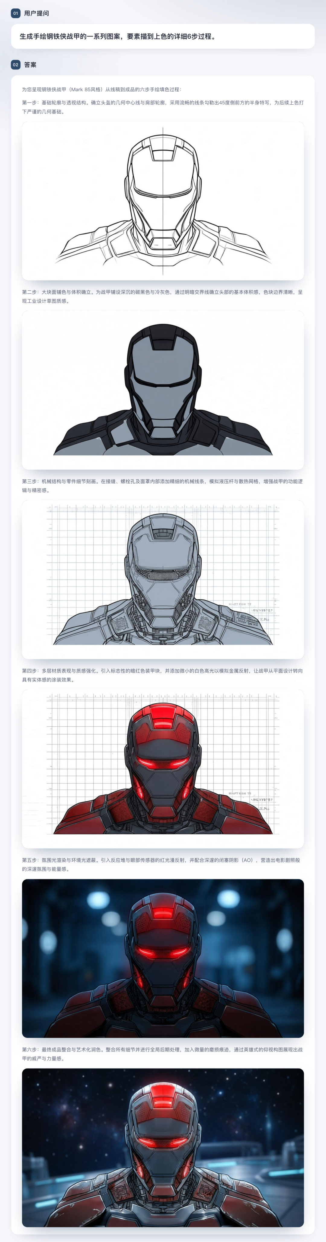 比如,绘制一个钢铁侠图案:它可以从扫描草稿出发,逐步进行连续创作,最终做出一个完成度很高的图像。每一步创作的过程对于前一步的结构和细节都做了保持——一个统一表征的共享上下文在其中发挥了关键作用。