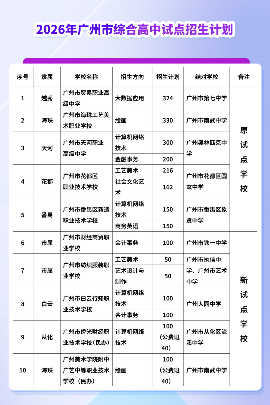 4月29日,广州日报新花城记者从广州市教育局官网获悉,广州已正式下达2026年综合高中招生计划,试点学校增至10所,招生计划提升至2432人,首次新增市属公办中职学校及特色民办学校参与试点,标志着广州市职普融通改革迈入更多元化、常态化的阶段。