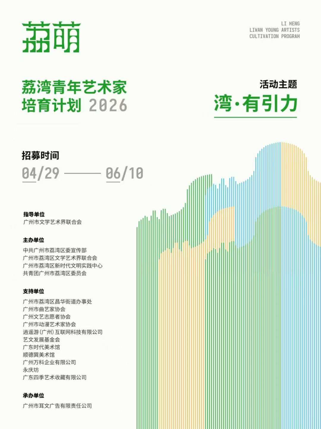 4月29日起,2026年广州荔湾区“荔萌·青年艺术家培育计划”正式启动招募。凡40周岁以下、生活在大湾区或有意在大湾区发展的青年艺术家均可报名;创作方向涵盖绘画、雕塑、装置艺术、数字艺术、平面设计等领域,今年新增动漫类别,鼓励跨界融合创新。招募将持续至6月10日。