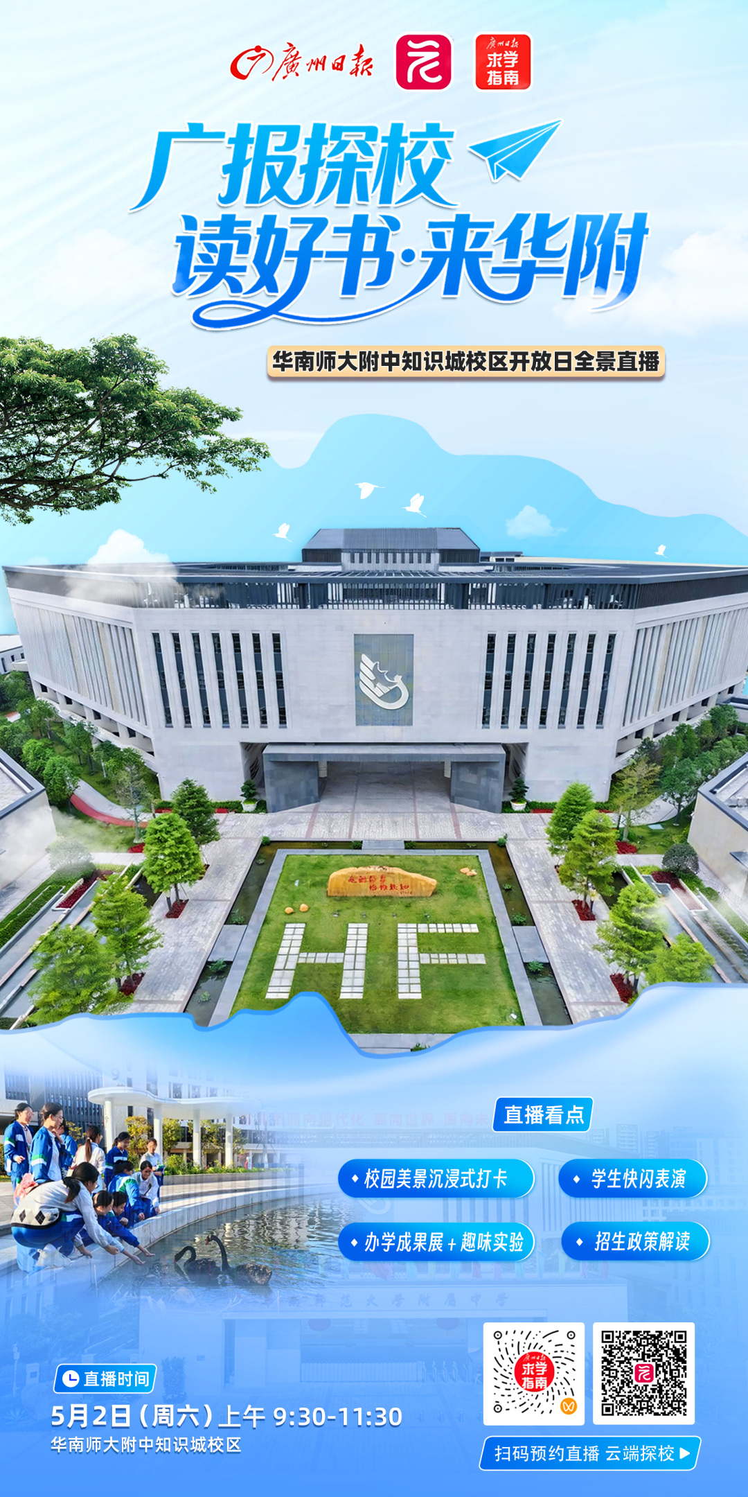5月2日上午9:30—11:30,华南师大附中知识城校区举办“读好书·来华附”高中招生校园开放日。广报探校将进行全景直播,欢迎广大考生和家长锁定直播间,解锁现场精彩。