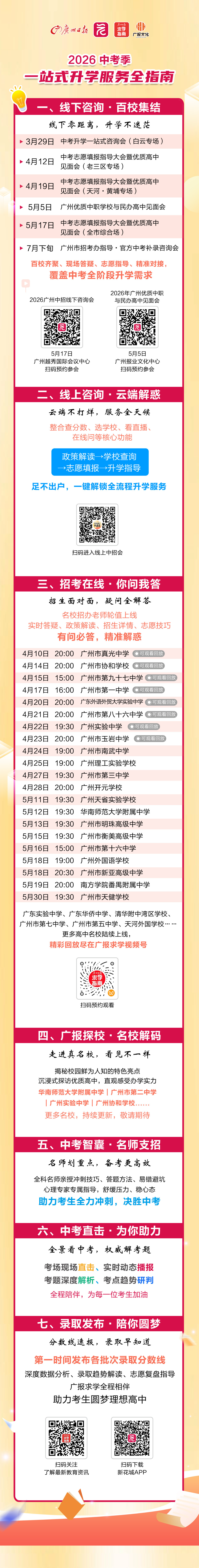 “五一”假期,广报求学君不打烊、持续在线服务。家长若暂无出行安排,既可线上收看云端探校全景直播,也可线下参与广州优质中职学校与民办高中见面会,丰富升学内容精彩不容错过。